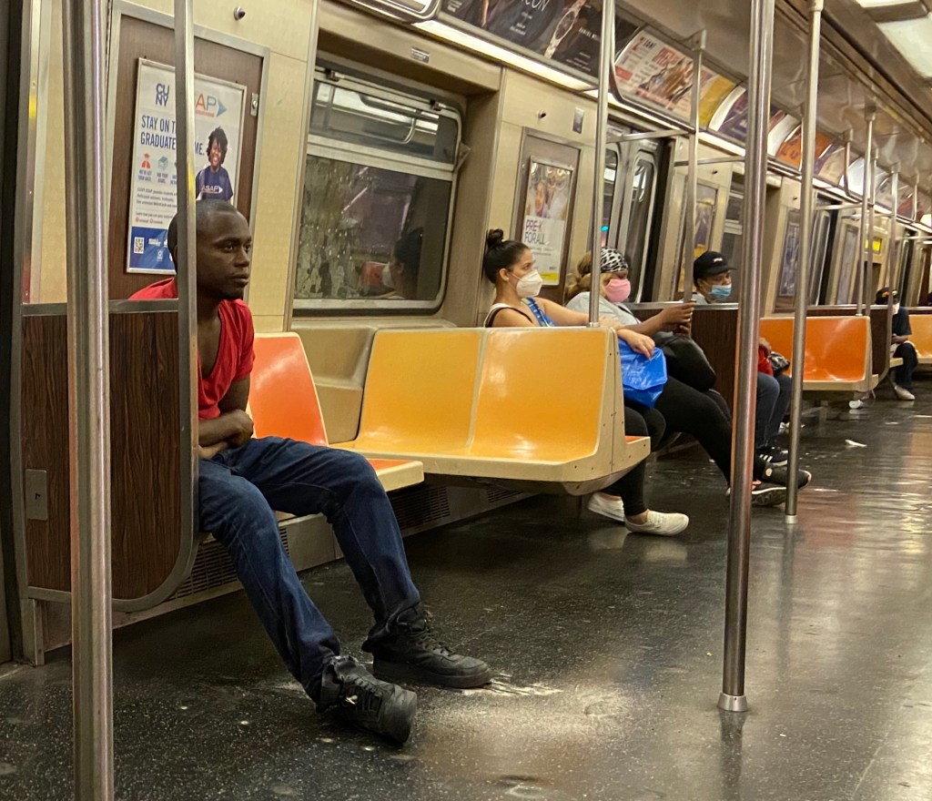 Construction worker removes his mask for a moment on a hot day, uptown A Train – Aug. 13th, Thurs. 2:30pm