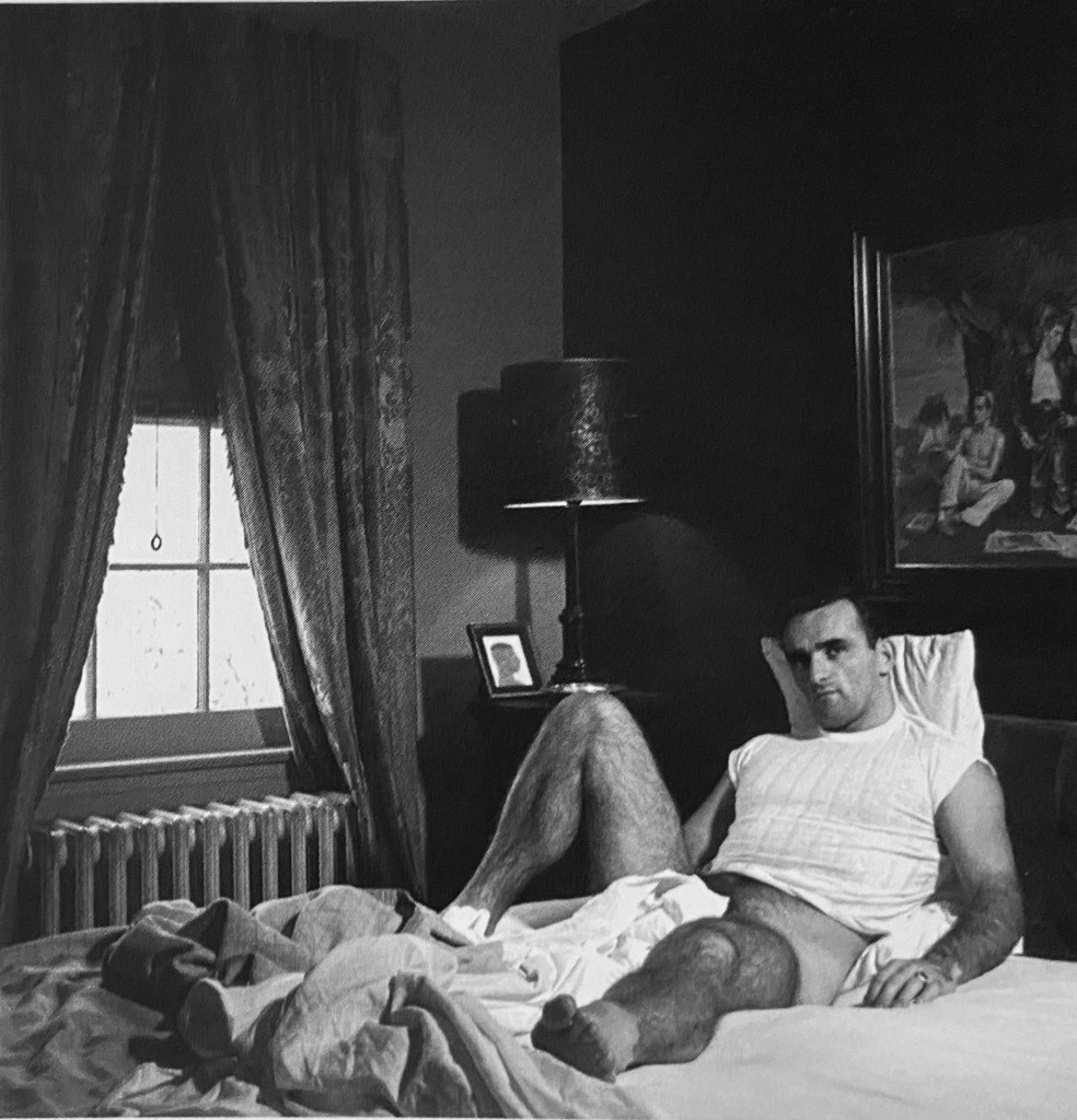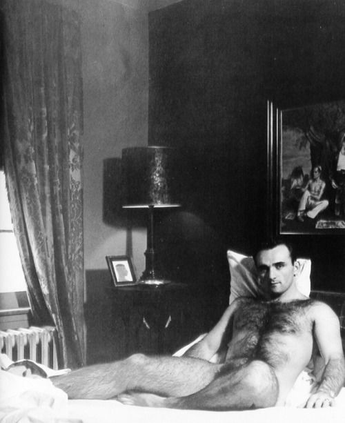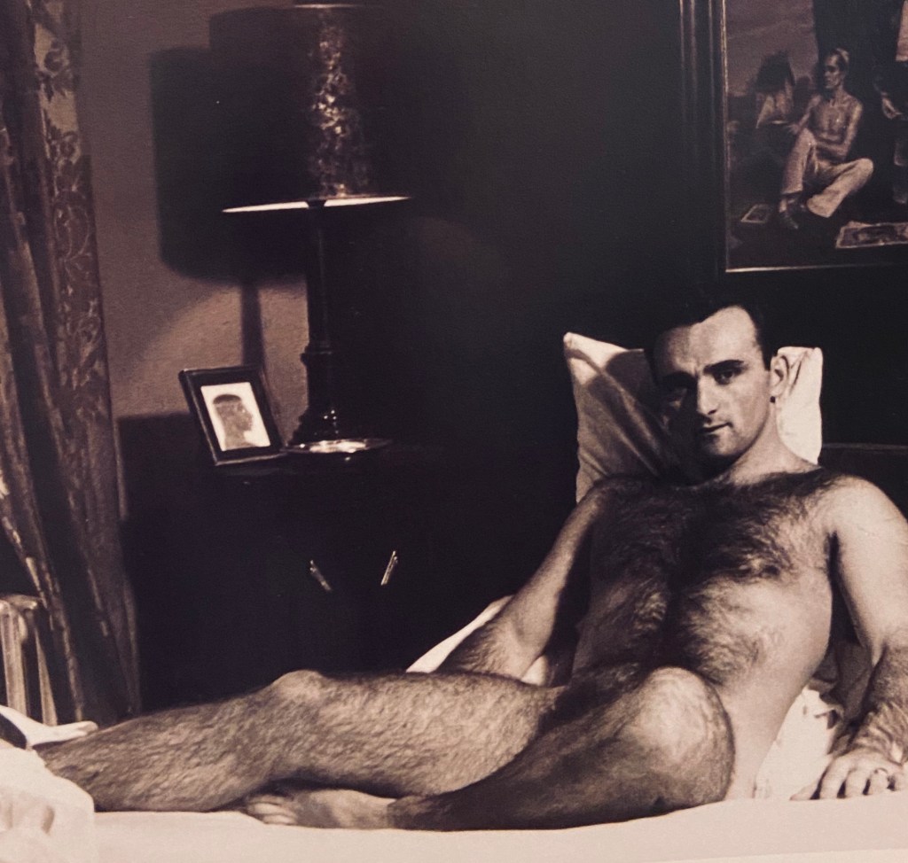 The model is Robert X. (Buddy) McCarthy – a WWII veteran described by author David Leddick as “a former gymnast from Boston with a sharp Irish wit.” The photo dates 1952 and was taken by George Platt Lynes in the boudoir of his own NYC apartment. The painting on the wall behind Buddy is Conversation Piece by Paul Cadmus (1940) and depicts Platt Lynes with museum curator Monroe Wheeler and writer Glenway Wescott, a couple with whom he was romantically involved. In the background is Stone-Blossom, the New Jersey farm the three of them shared for over a decade.