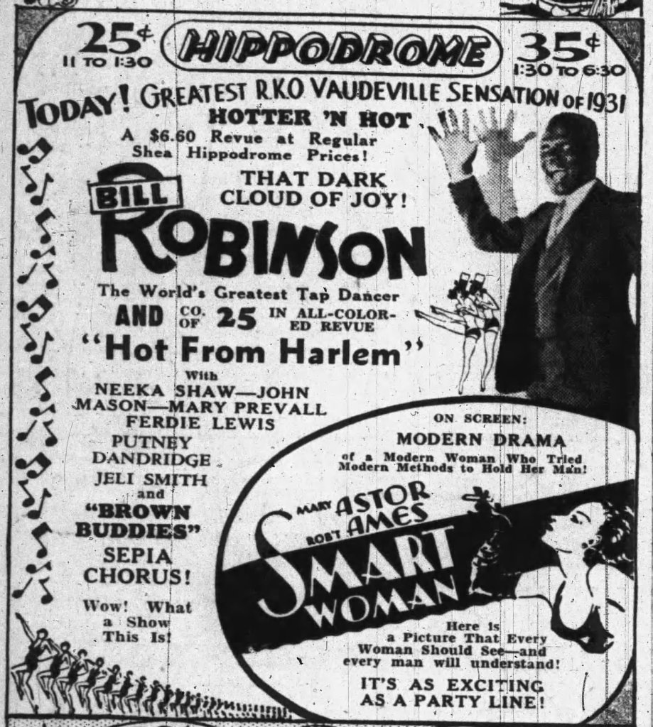 By that time, Neeka had been on the road for several months with Bill “Bojangles” Robinson’s Hot From Harlem revue. Neeka once again received special recognition, with a notice from Washington D.C.’s Howard Theater engagement stating “Neeka Shaw, demure tiny star of Harlem, was the big reason for the success of Bojangles’ show…”