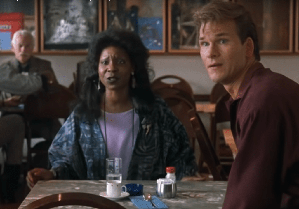 Kurt Bieber behind Whoopi Goldberg and Patrick Swayze in a scene from Ghost (1990)