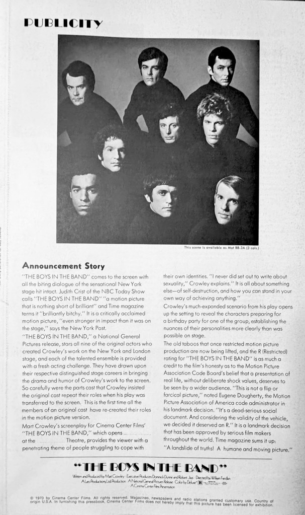 Whenever I see posts on social media that mention the 1970 film The Boys In The Band, there are always strongly opposing viewpoints. Whether you love or hate the film, everyone can agree that it is a cultural touchstone. Like the Stonewall uprising itself, The Boys In The Band serves as a landmark, with every other gay-themed film described as either preceding or following it.