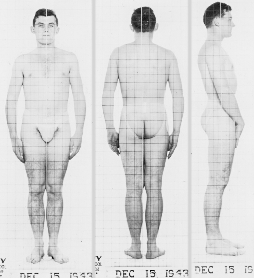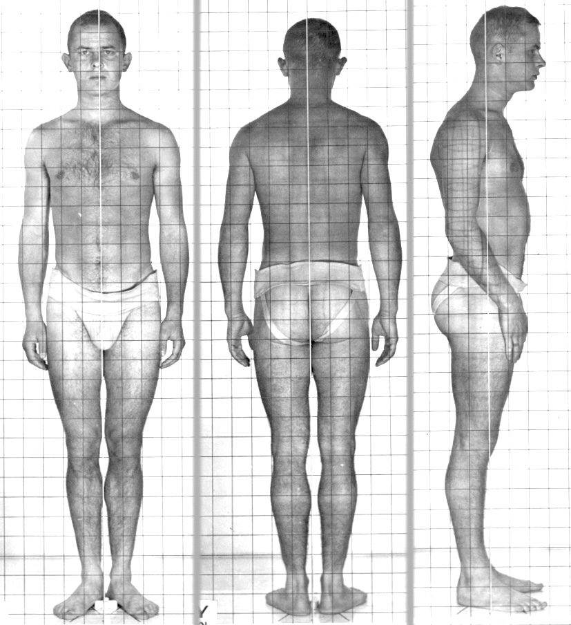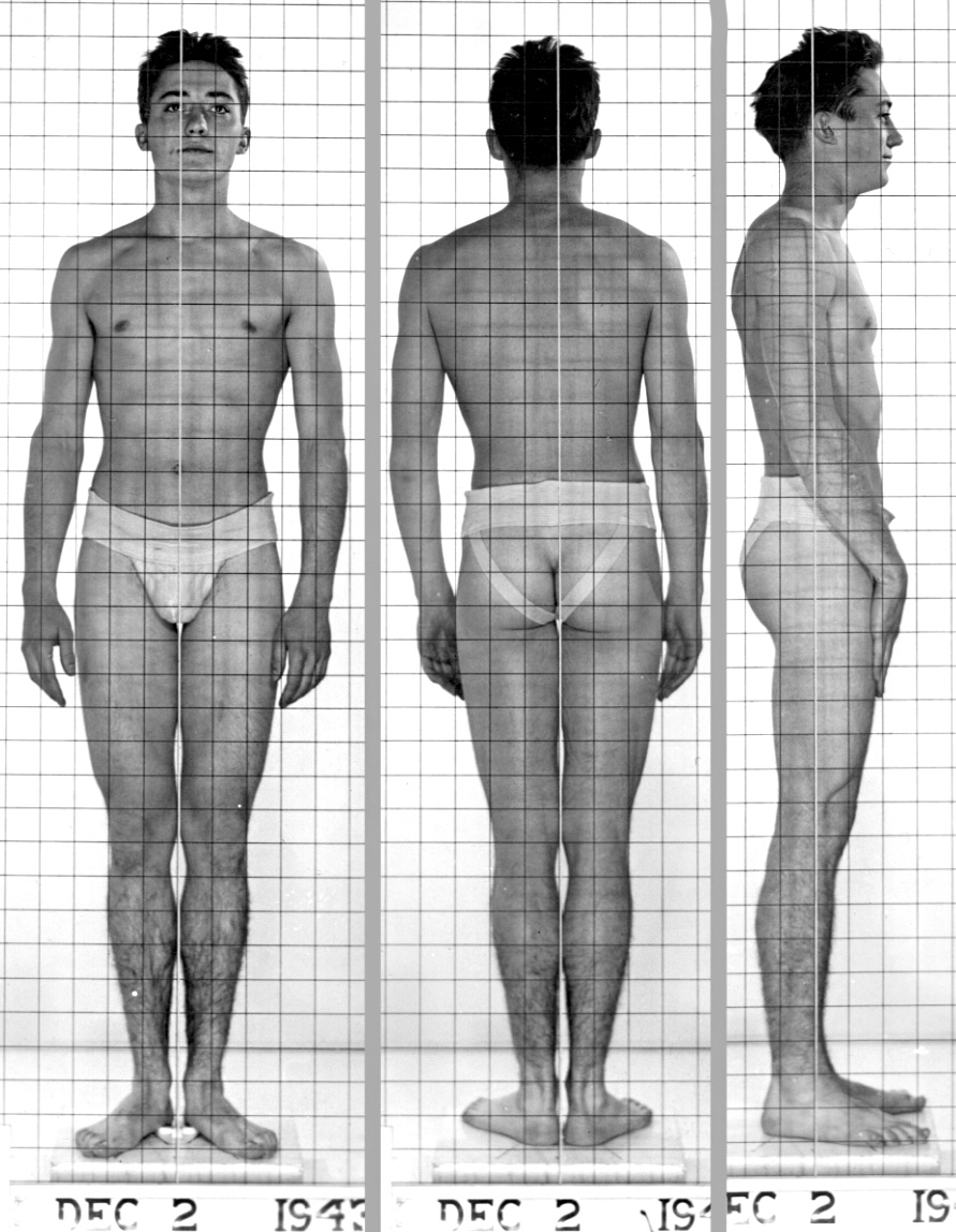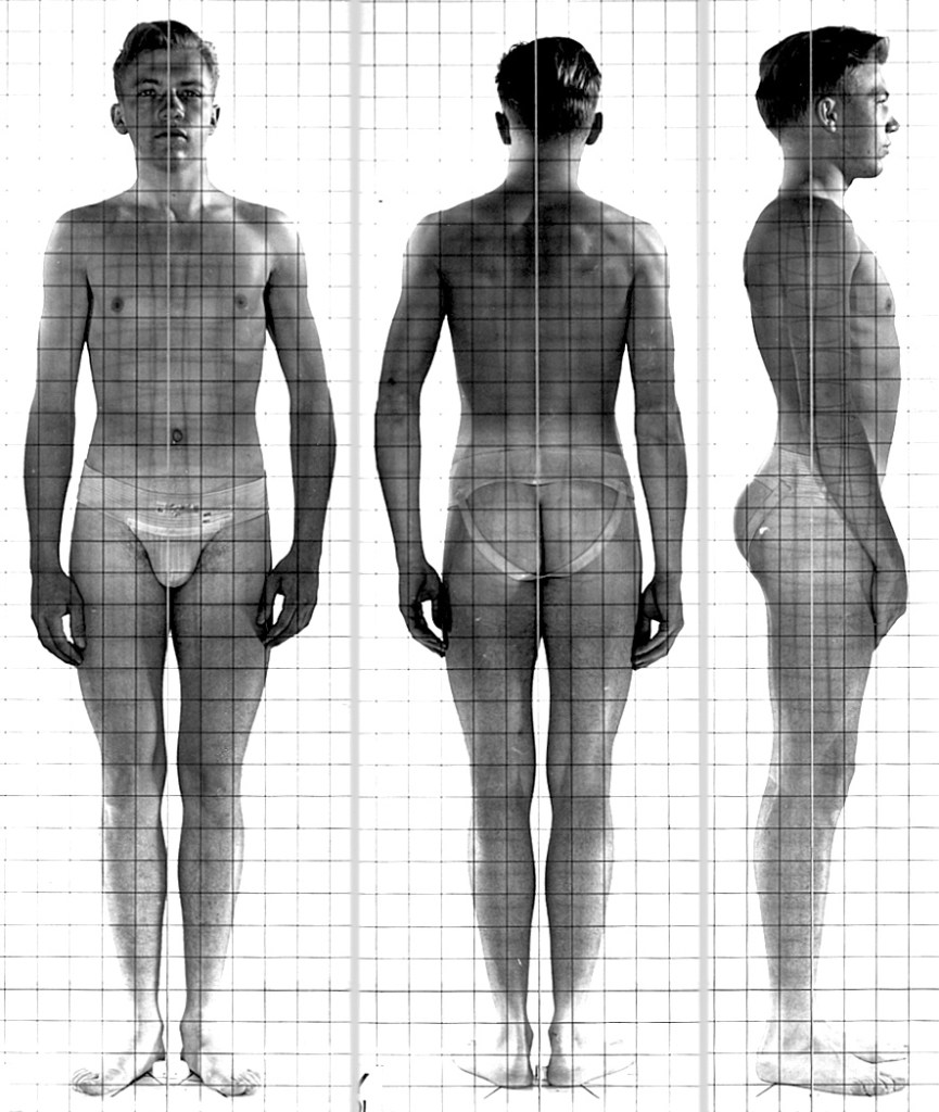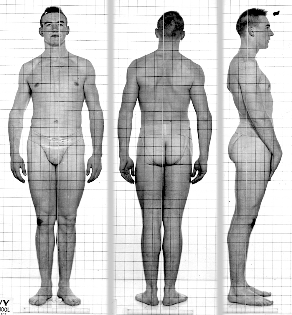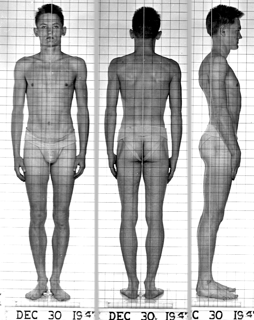The earliest photos (from June 13, 1942) feature the men completely nude, but all subsequent photos feature the cadets in jockstraps, standing behind some sort of grid fencing to better detect posture misalignment and spinal curvature.