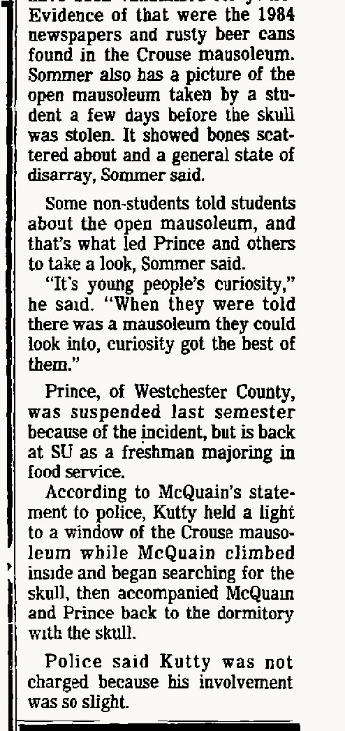 The vandalized mausoleum contained John and Catherine Crouse and their two sons. The Crouse family was a wealthy philanthropic clan that loomed large in the area for generations. A fair percentage of the city of Syracuse bears the Crouse name. John Sr. funded the University’s Crouse College to honor his wife. Their son, John Jacob Crouse, Jr. served as the mayor of Syracuse. All of the coffins in the tomb were vandalized, but the cranium in question belonged to John Jr.